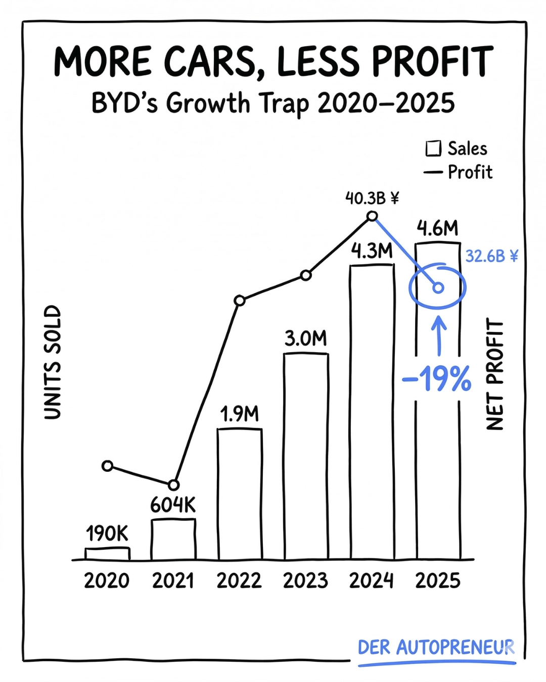 Jetzt sind die Geschäftszahlen für 2025 da. Und die ersten Daten für 2026. Sie erzählen eine andere Geschichte. Der Gewinn ist um 19% gefallen. Bereinigt um Subventionen sogar um die Hälfte. Und in China ist BYD Anfang 2026 von Platz 1 auf Platz 4 abgerutscht.