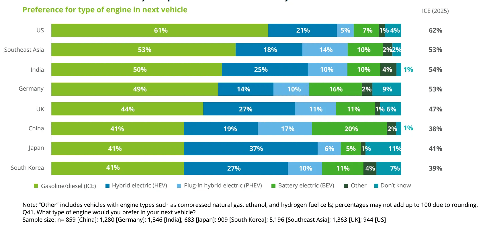 Am anderen Ende liegen Japan und Südkorea bei 41% Verbrenner-Präferenz. Auf einem Level mit China.