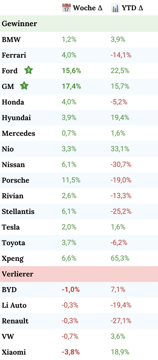 Hier die Wochenperformance der wichtigsten Automotive-Werte: